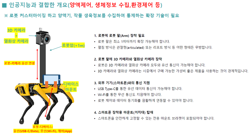 내용 : [사업목표-연구개발] ■ 생체정보 기반의 AI·로봇 융합 기술을 통해 작물 생육 상태를 정밀 예측하고, 양액을 자동·정밀 제어하는 지능형 스마트팜 시스템을 개발함. ■ 스마트팜 요소기술(AI 생육예측, 로봇팔, 제어, 클라우드 플랫폼)을 통합한 실증형 플랫폼을 구현하고, 특허·논문·기술이전 등 성과로 연결함.